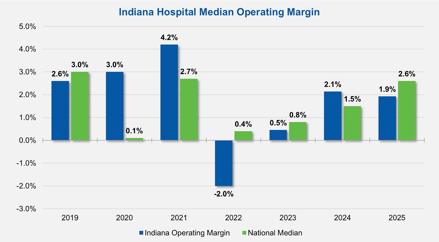 Indiana hospitals posted a median operating margin of just 1.9% in 2025—well below the national 2.6%—with operating income dropping 5.5% ($50 million less year-over-year) despite slashing contract labor by nearly 50%. Kaufman Hall modeling warns of nearly $1 billion in annual statewide losses within 3–5 years without Medicaid rate reform and relief from surging labor, supply, and ED visit costs (up 16.8%). Leaders from Community Health Network, Methodist Hospitals, and Greene County General (which closed OB services Jan. 31) say under-reimbursement and inflation are forcing painful service cuts.